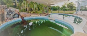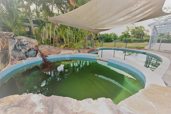 A large covered veranda which offers extended covered entertaining overlooking the split-level pool with the spa cascading into the main pool and looking on to the manicured lawn.