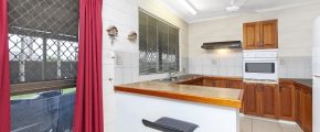 The kitchen has plenty of bench and cupboard space as well as breakfast bar for the quick getaway meal or perfect for entertaining and features a safe electric stove.
