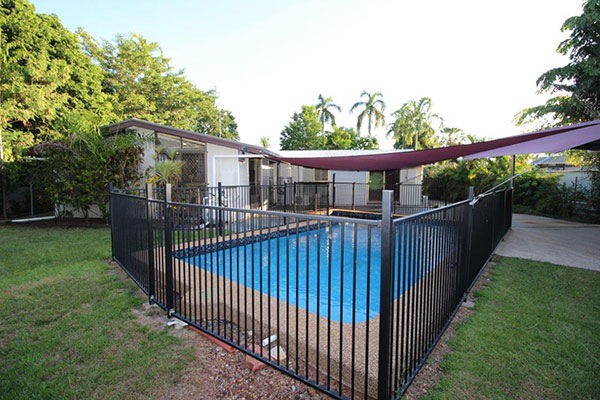 Sparkling concrete in ground pool with shade sail