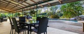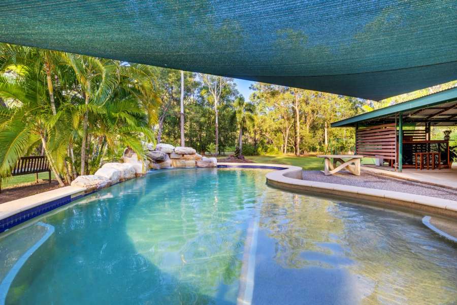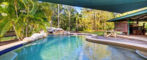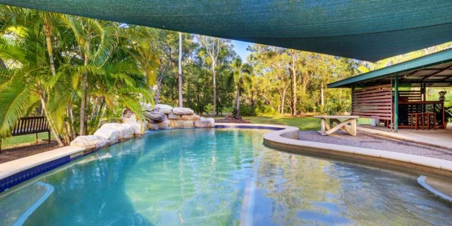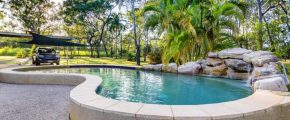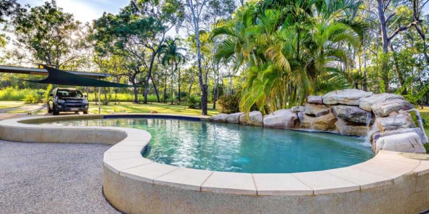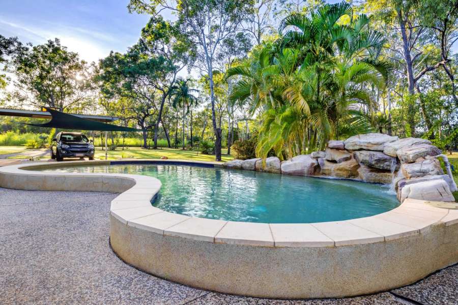 Sparkling resort style PebbleCrete saltwater pool surrounded by immaculate native bush land