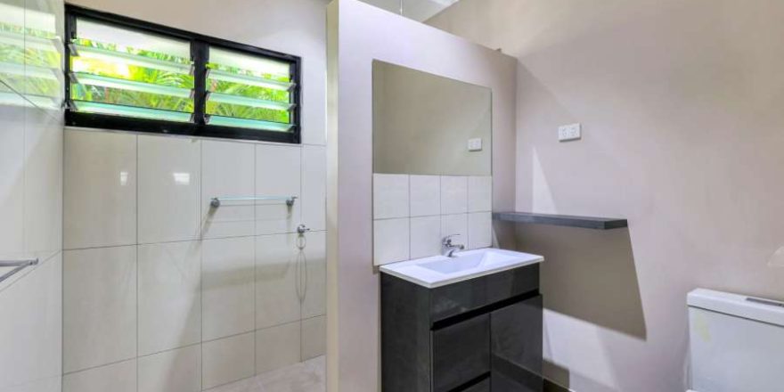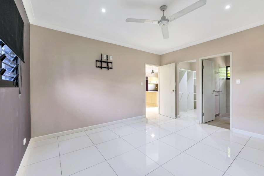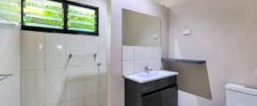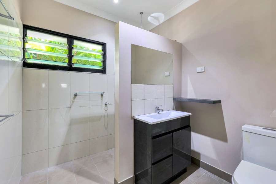 At street level the home has dual carport parking and side parking for the boat or trailer. A tropical garden screens the master bedroom suite which resides towards the front of the home and includes an ensuite bathroom and generous walk in robe along with tiled flooring and A/C plus banks of louvred windows to let in the gentle cross breeze.